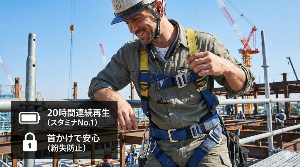 - 高所作業で絶対に落としたくないなら 👉 【ネックバンド型(Audio-Technicaなど)】 を選びましょう。 物理的に繋がっている安心感は絶大です。バッテリー持ちも良く、長時間作業の強い味方になります。