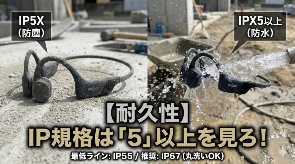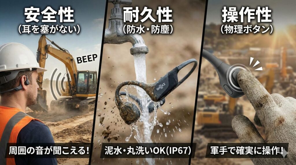 現場という環境は、一般的なオフィスワークとは比べ物にならないほど過酷です。だからこそ、選ぶべきは「音質の良さ」よりも、「タフさ」と「安全性」。