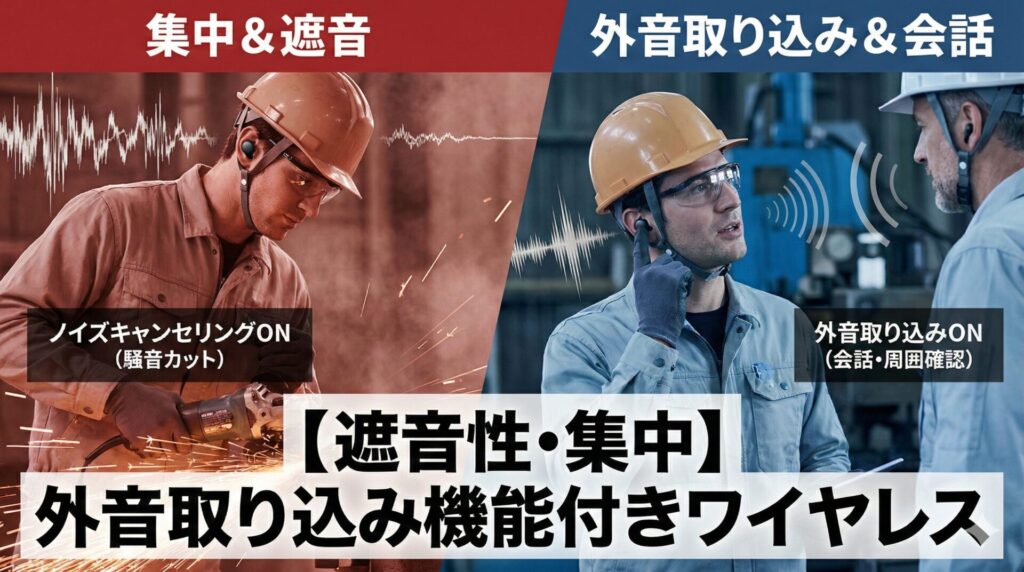 騒音が激しい現場で「耳栓代わり」に使いたい場合はこちら。ただし、高性能な「外音取り込みモード」がある機種を選ばないと、周囲の音が聞こえず危険です。