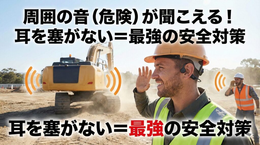もし現場監督や安全担当者に注意されたら、「これは骨伝導といって、耳を塞がないので指示も重機の音も聞こえます」と説明してみてください。理解ある現場なら許可が出ることが多いですが、最終的にはその現場のルール(KY活動などの取り決め)に従ってください。