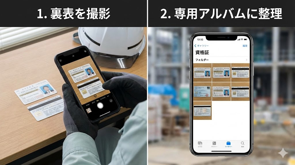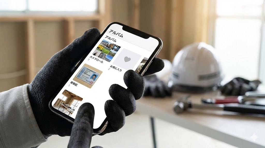 そんな時、スマホですぐに情報を引き出せれば、現場監督や元請けに事情を説明しやすくなります。 (※原則として原本不携帯は作業NGですが、「画像がある」だけで信頼度が変わり、現場での対応がスムーズになることは多いです)