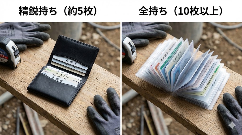 - 5枚以下(精鋭持ち): 「玉掛け」「フォークリフト」「職長」など、その日の作業や入場に必要な主要資格だけを持ち歩くスタイル。この場合は、胸ポケットに入れても邪魔にならない「スリムタイプ」や「2つ折りタイプ」がおすすめです。