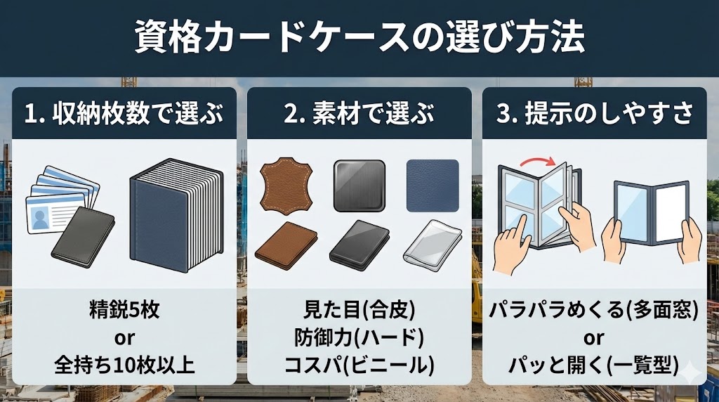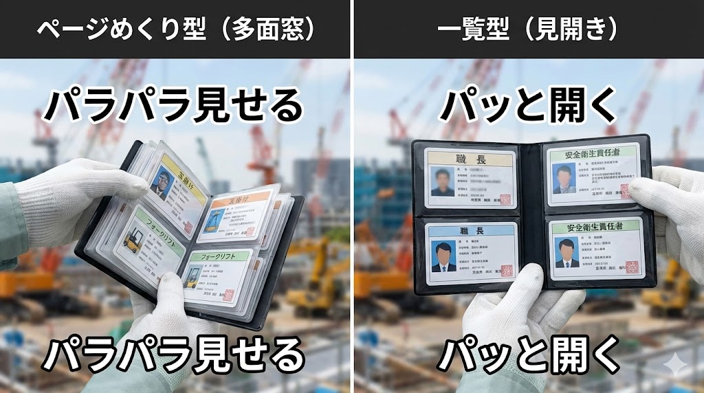 - 10枚以上(全持ち): 技能講習、特別教育、安全衛生責任者証など、保有する全ての資格を常に携帯したいベテランや現場代理人は、「手帳(ブック)タイプ」や「大容量ホルダー」を選びましょう。