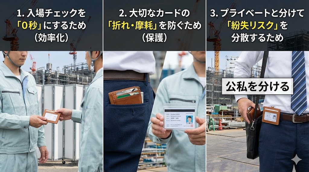 「たかがカード入れ、財布に入れとけばいいじゃん」と思うかもしれませんが、現場専用のケースを持つことには、単なる整理整頓以上のメリットがあります。