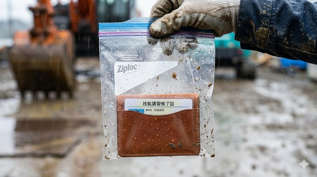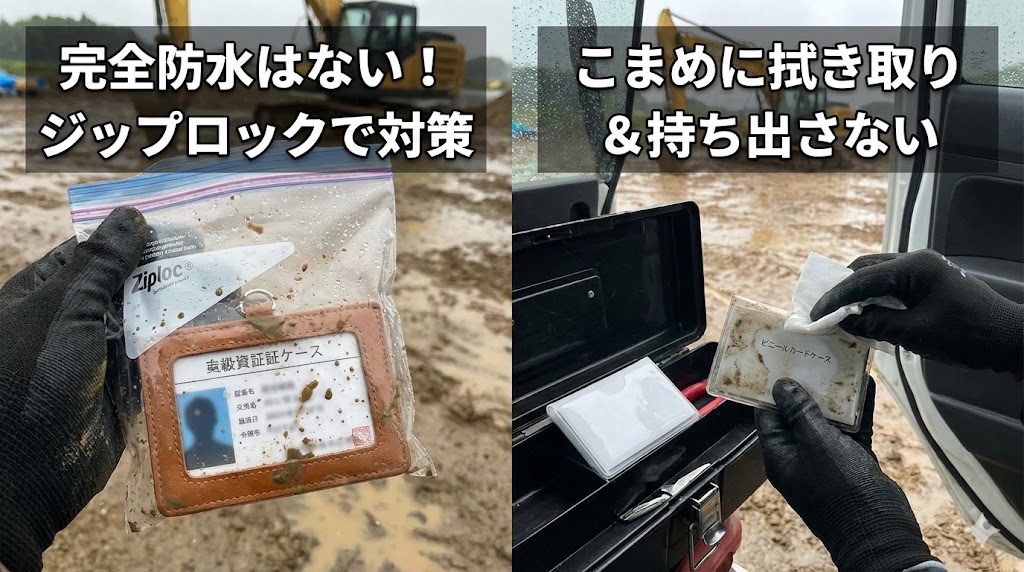 大雨の日や、水しぶきがかかる作業の日は、ケースごと「ジップロック(チャック付きポリ袋)」に入れてしまうのが最も確実で安上がりな対策です。 見た目は少し不恰好ですが、中身が濡れるよりはマシです。透明な袋なら、袋に入れたまま提示も可能です。
