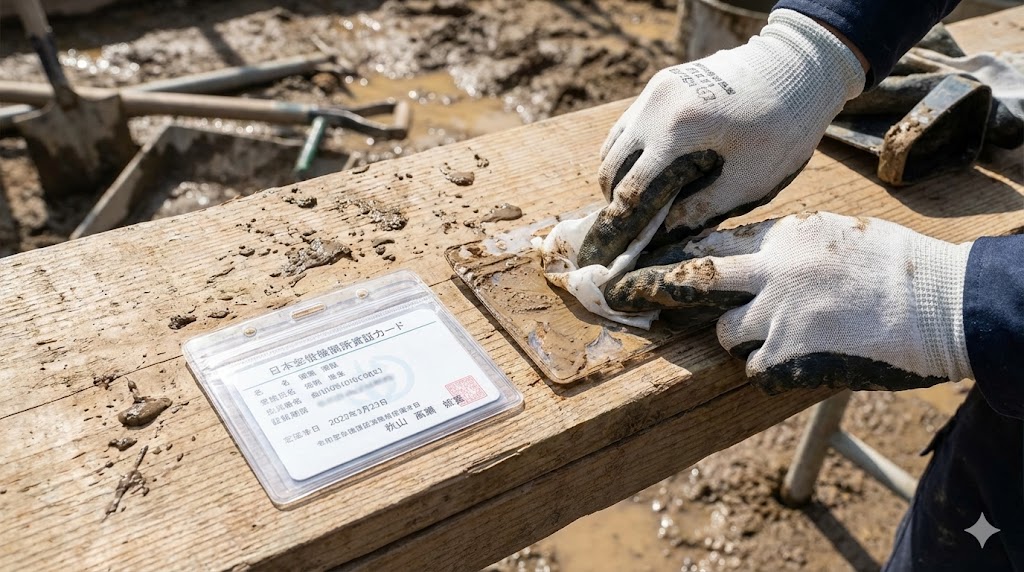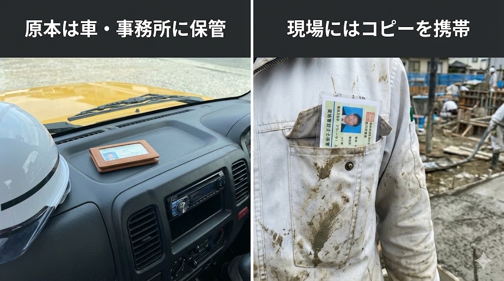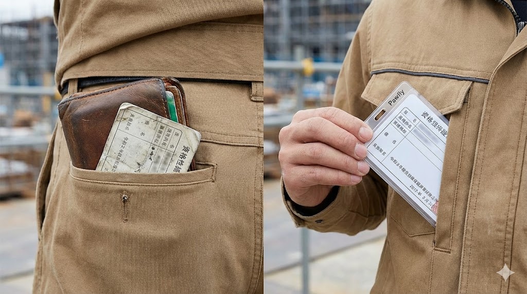 その代わり、胸ポケットには「資格証のカラーコピー(パウチ加工したもの)」だけを入れておく。 これなら、どれだけ汚れても原本は無傷です。 ※現場のルール(原本携帯必須かどうか)を必ず確認してから実行してください。