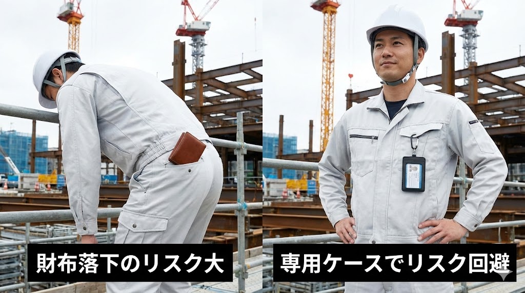仕事で使う資格証と、プライベートの財布を物理的に分けておくことは、リスク管理の基本です。 万が一、作業中にケースを落としたとしても、被害は「仕事のカード」だけに留められます。「現場には必要最低限のものしか持ち込まない」のが、トラブルを避ける鉄則です。