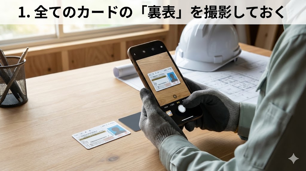 「10年前に取った玉掛けの資格、どこの教習所だったっけ…?」となると、探すのが本当に大変です(最悪の場合、取り直しになります)。 新しいケースに入れ替えるタイミングで、全てのカードの「表面」と「裏面」をスマホで撮影しておきましょう。これさえあれば、再発行の手続きがスムーズに進みます。