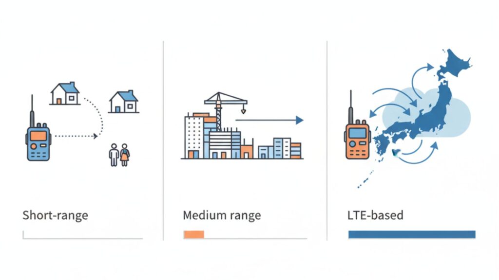 トランシーバーは、電波の強さ(パワー)によって大きく3種類に分かれます。現場の広さに合わせて選びましょう。