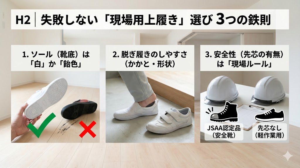 現場用の室内履き選びで最も重要なのは、「デザイン」や「価格」ではありません。 「施主様への配慮(マナー)」と「現場での実用性」です。
