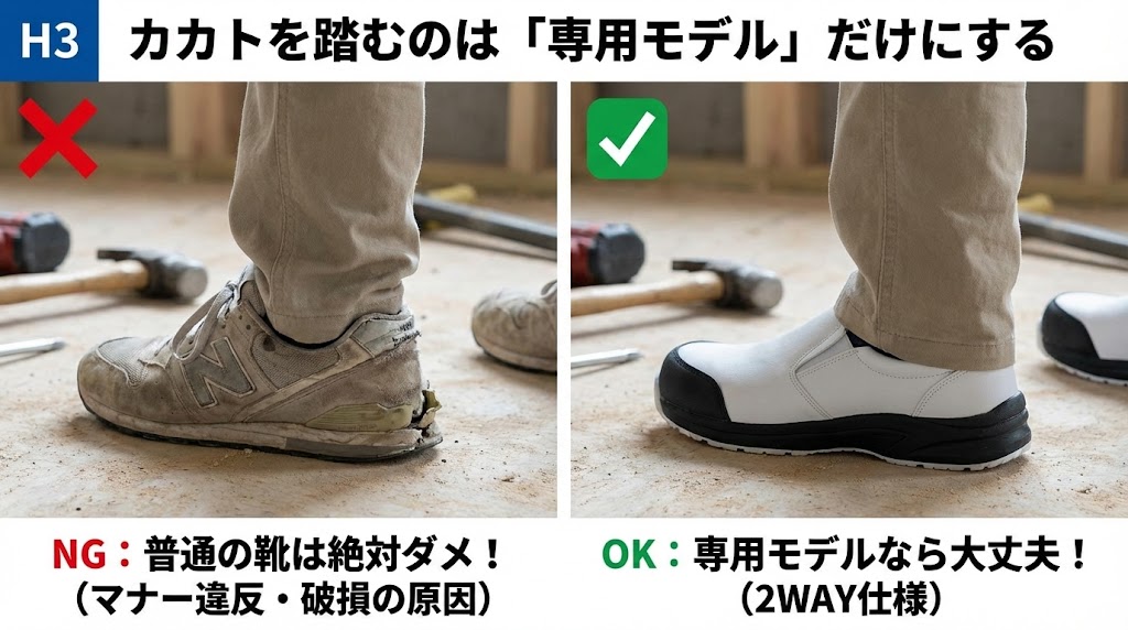まとめると… まずは「靴底が白いこと」を確認し、その上で自分の現場が「安全靴必須か(先芯)」、「脱ぎ履きの頻度が高いか(カカト)」を基準に選べば、失敗することはありません。