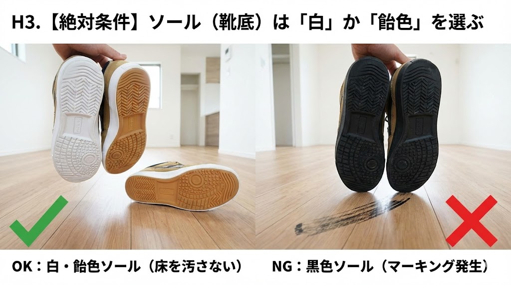 - なぜダメなのか? 黒いソールは、床と擦れた際に消えにくい黒い筋(ラバーマーク/マーキング)を残してしまうリスクが高いためです。これはクリーニングでも落ちにくく、最悪の場合、施主様からのクレームや床の張り替え補償に発展しかねません。
