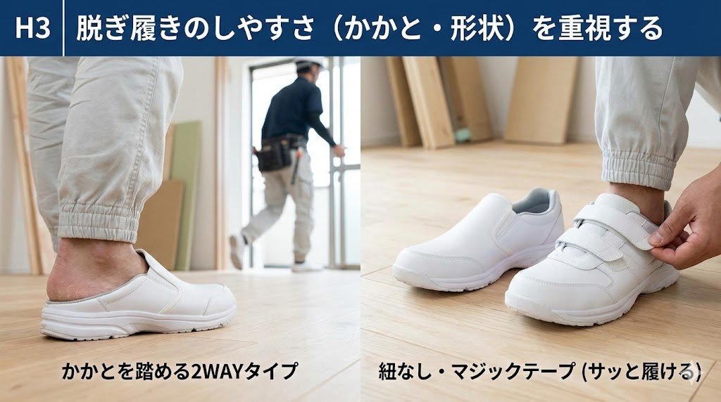 「道具を取りに車へ」「トイレへ」…出入りが激しい現場では、かかとが踏めることが最大の武器になります。