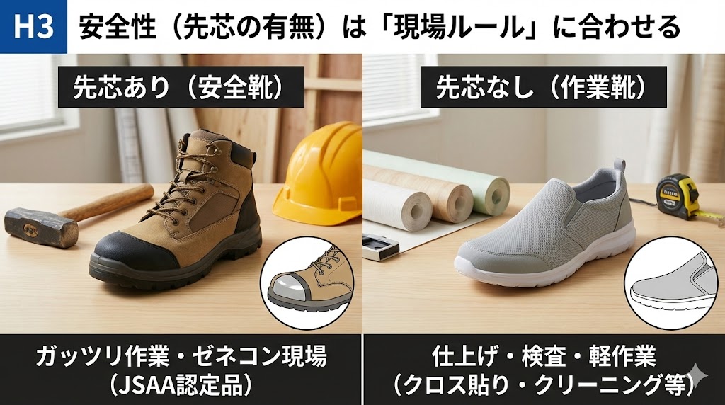 - 仕上げ・検査・軽作業(先芯なし) クロス貼り、クリーニング、施主検査などがメインで、重い物を扱わない場合は、「先芯なしの作業靴」がおすすめです。先芯がない分、靴が軽く、屈曲性が良いため、しゃがみ作業が楽になります。