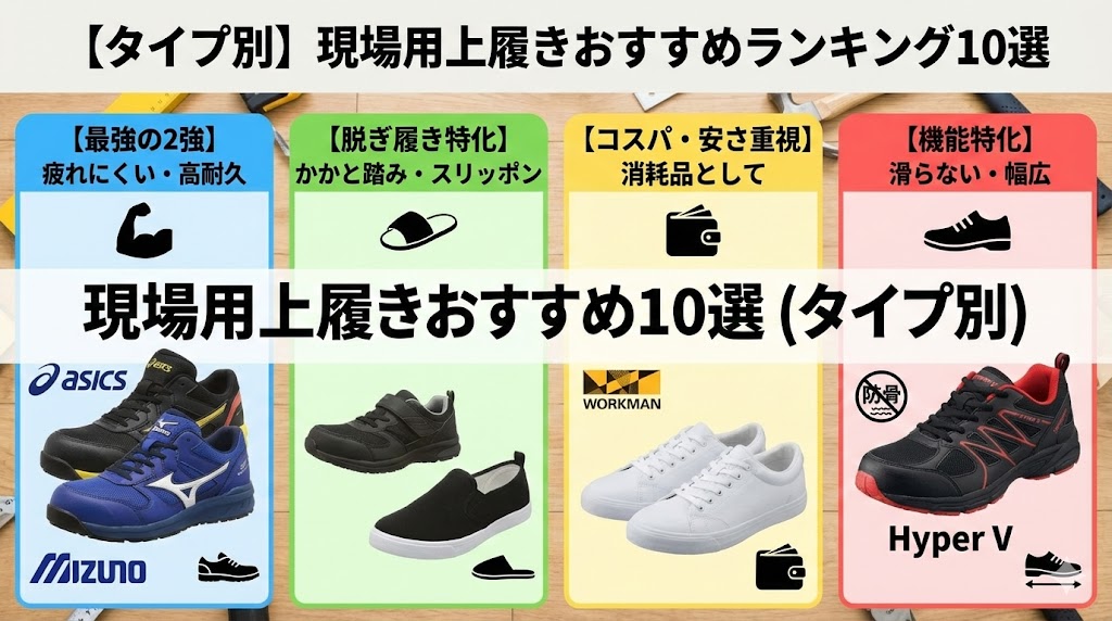 そこで今回は、現場経験者の目線から「床を汚さない白底」「脱ぎ履きが楽」「疲れにくい」という条件を満たした、おすすめの現場用上履きを厳選してご紹介します。