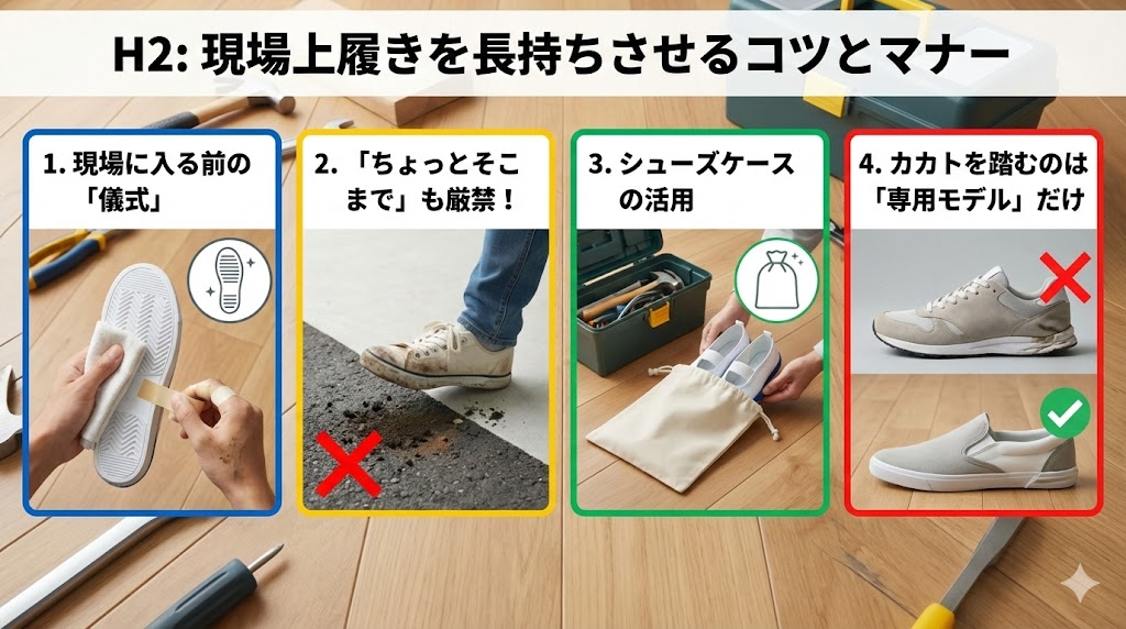 どれだけ良い靴を選んでも、使い方が悪ければ施主様の床を傷つけたり、すぐに壊れてしまったりします。 現場のプロとして守るべきマナーと、お気に入りの靴を長く使うためのコツを紹介します。