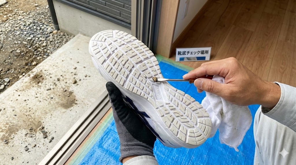 最も恐ろしいトラブルは、靴底の溝に挟まった「小石」や「金属片」による床のひっかき傷です。 現場に入る前は、以下の手順を必ず行いましょう。