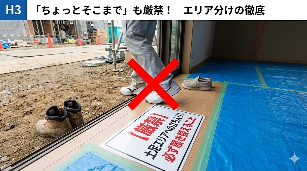 - 養生テープでペタペタ: 仕上げの現場など、特に気を使う場合は、靴底に養生テープをペタペタと貼って剥がし、細かい砂埃まで除去するのがプロの気遣いです。