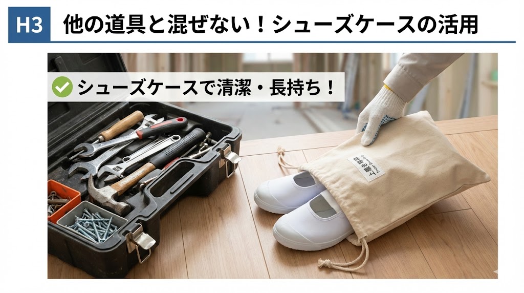 上履きをインパクトドライバーやハンマーと同じカゴに放り込んでいませんか? 道具と擦れることでアッパー(靴の表面)が傷ついたり、油汚れが移ったりして劣化が早まります。