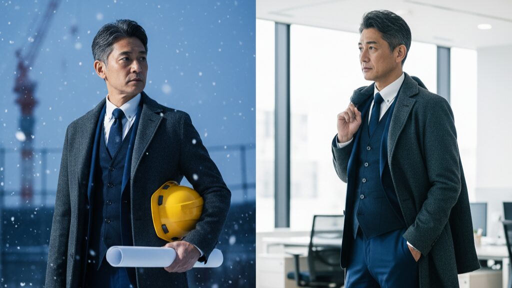 求められる要件: この職種での最優先事項は、防寒性よりも「着ぶくれしない」ことです 。スーツや制服のシルエットを崩さず、スマートに着こなす必要があります 。また、アウターのコートを脱いだオフィス内でも、違和感のない格好が求められます。